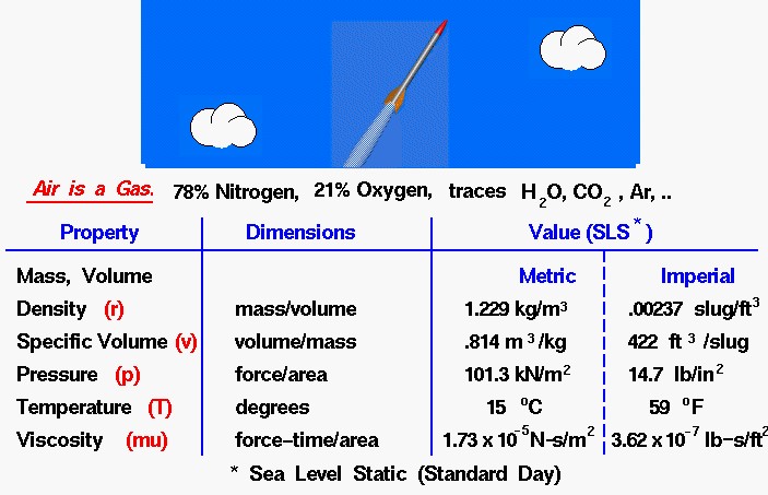 \(\LARGE \rho=1.229 \; \frac{\text{kilograms}}{\text{cubic meters}}=.00237 \;\frac{\text{slug}}{\text{cubic feet}}\)