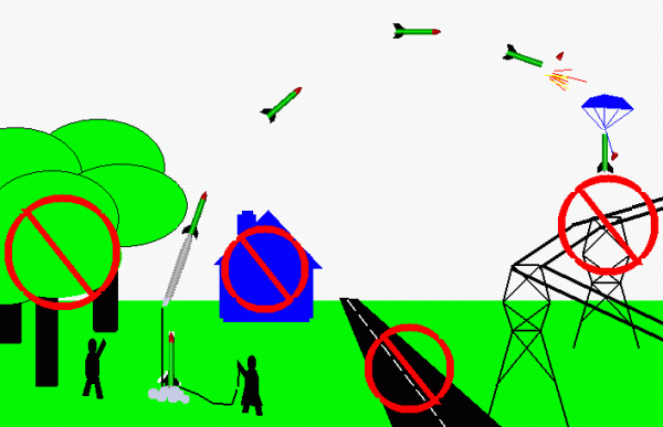 Fly your rocket in an open field where there are no obstacles. Never fly near trees. If your rocket ends up in a tree, you’re going to need a new rocket. Never fly near a highway. You can be hurt chasing your rocket across the highway and people driving by are often distracted by model rockets. Never fly near houses. Your rocket can do damage to the windows, sidings and roof of a house. If your rocket ends up on the roof, you’re going to need a new rocket. And never, ever fly near high tension wires. That’s a sure way to lose a rocket.